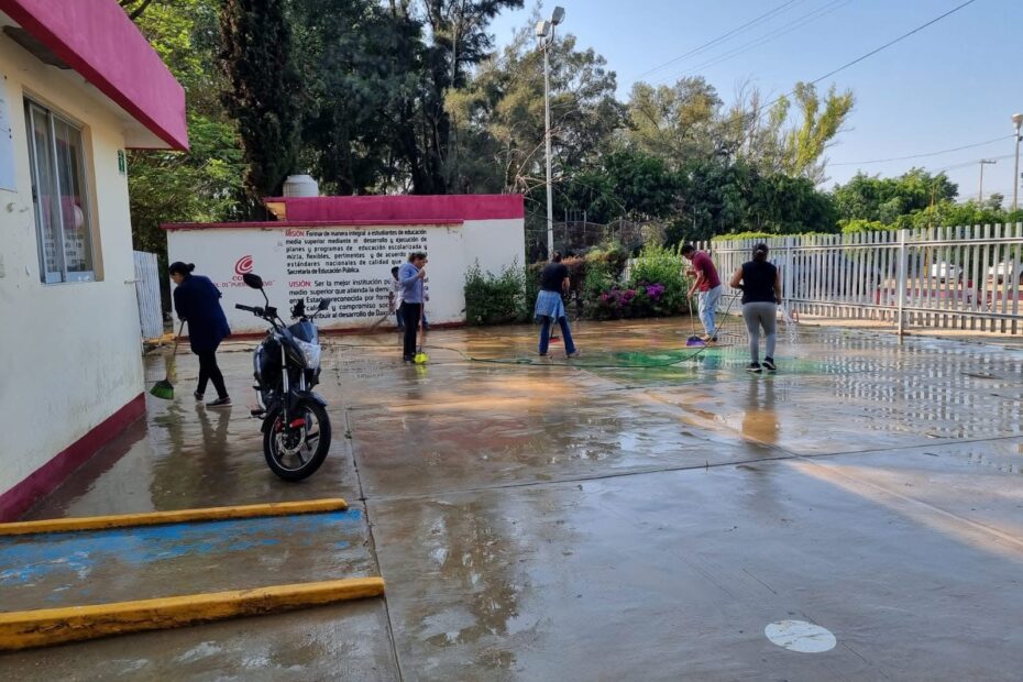 Tras el paso del fenómeno, trabajadores del plantel iniciaron labores de limpieza y desazolve, enfocadas en retirar agua, lodo y residuos acumulados, además de revisar los espacios más afectados para dimensionar los daños.