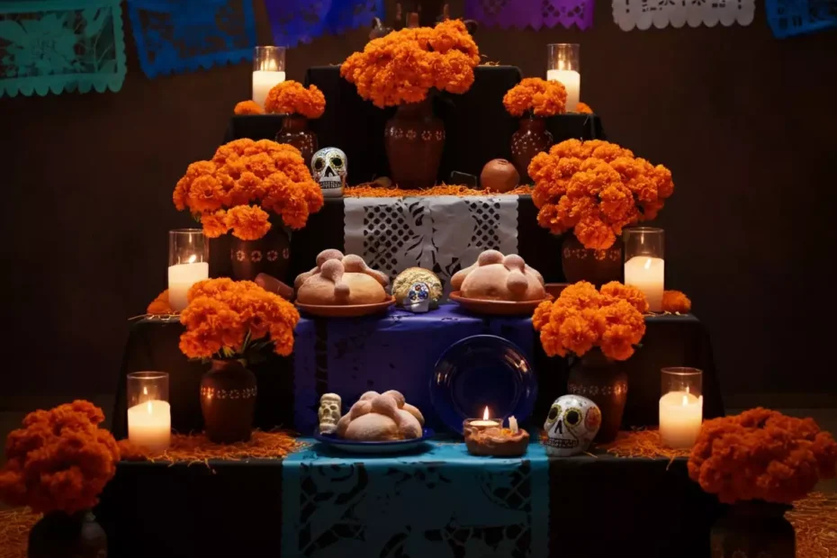 En cuanto a los elementos que lo componen, cada uno tiene un papel esencial: el agua calma la sed después del viaje; las velas iluminan y guían; la flor de cempasúchil abre el camino con su aroma; el pan de muerto representa tanto la vida como la muerte; el papel picado alude al aire y al movimiento de las almas; la sal purifica el espíritu; el copal o incienso limpia el ambiente; y las calaveritas, fotografías y objetos personales recuperan la identidad del difunto. Cada símbolo es una voz que habla al misterio del regreso.