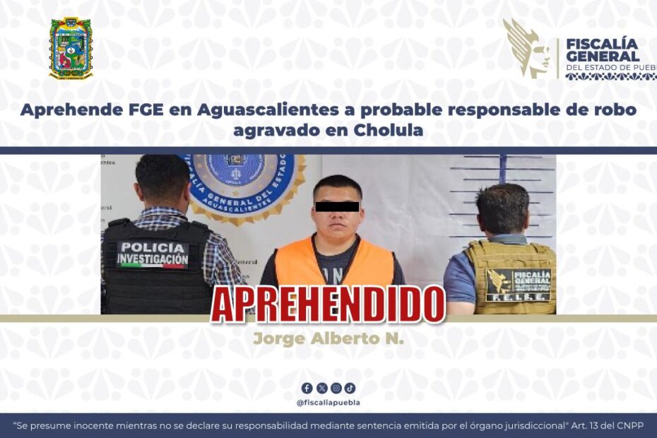 Como resultado de labores de investigación y colaboración interinstitucional, la Fiscalía General del Estado de Puebla (FGE) cumplimentó una orden de aprehensión en contra de Jorge Alberto N., de 25 años, por su probable responsabilidad en el delito de robo agravado, por hechos ocurridos en el municipio de San Pedro Cholula.