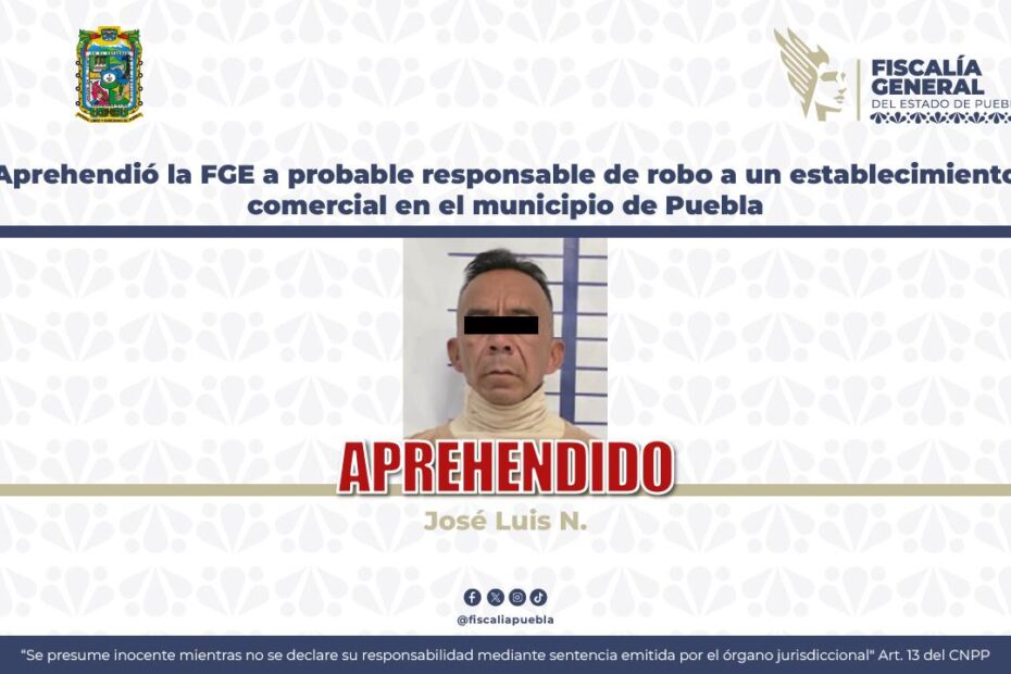 La Fiscalía General del Estado dio cumplimiento a la orden de aprehensión en contra de José Luis N., de 45 años de edad, por su probable responsabilidad en el delito de robo agravado a comercio, ocurrido en el municipio de Puebla.