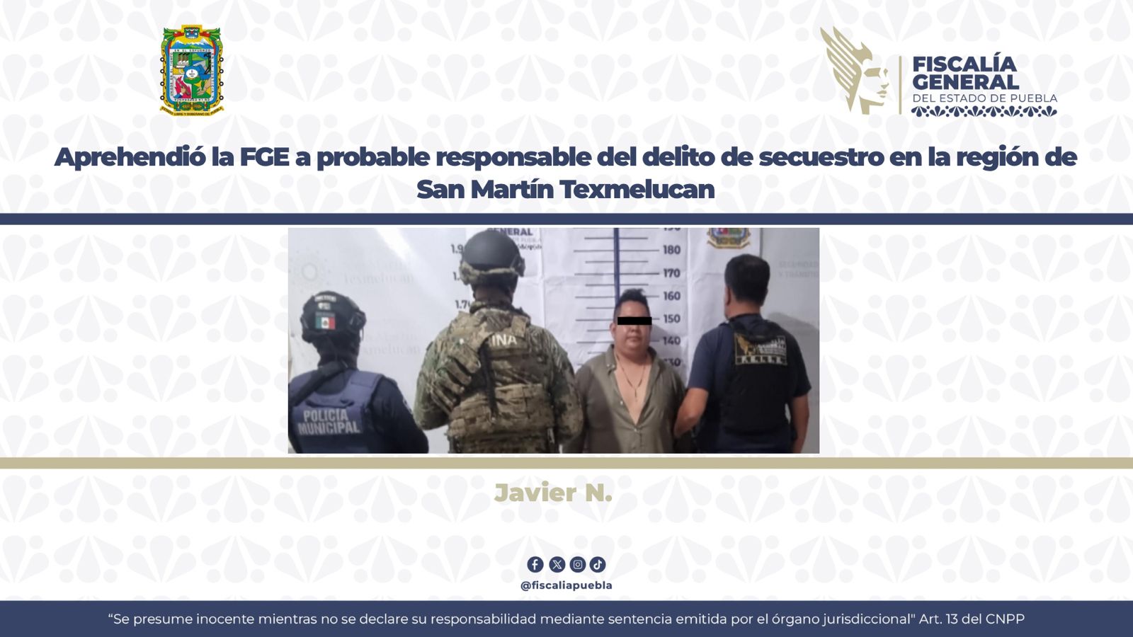 La Fiscalía General del Estado, con apoyo de la Secretaría de Marina (SEMAR) y la Policía Municipal, dio cumplimiento a la orden de aprehensión en contra de Javier N., por su probable responsabilidad en el secuestro agravado de dos personas en la región de San Martín Texmelucan.