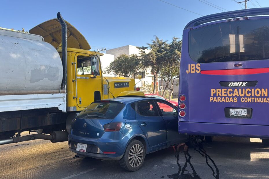 Un percance vial se registró sobre la Calzada Ignacio Zaragoza, a la altura de Parque Puebla, donde se vieron involucrados un auto particular, una pipa y una unidad del transporte público de la ruta JBS, conocida como “morados”, con número económico 8. El incidente generó afectaciones a la circulación en esta importante vialidad de la ciudad.