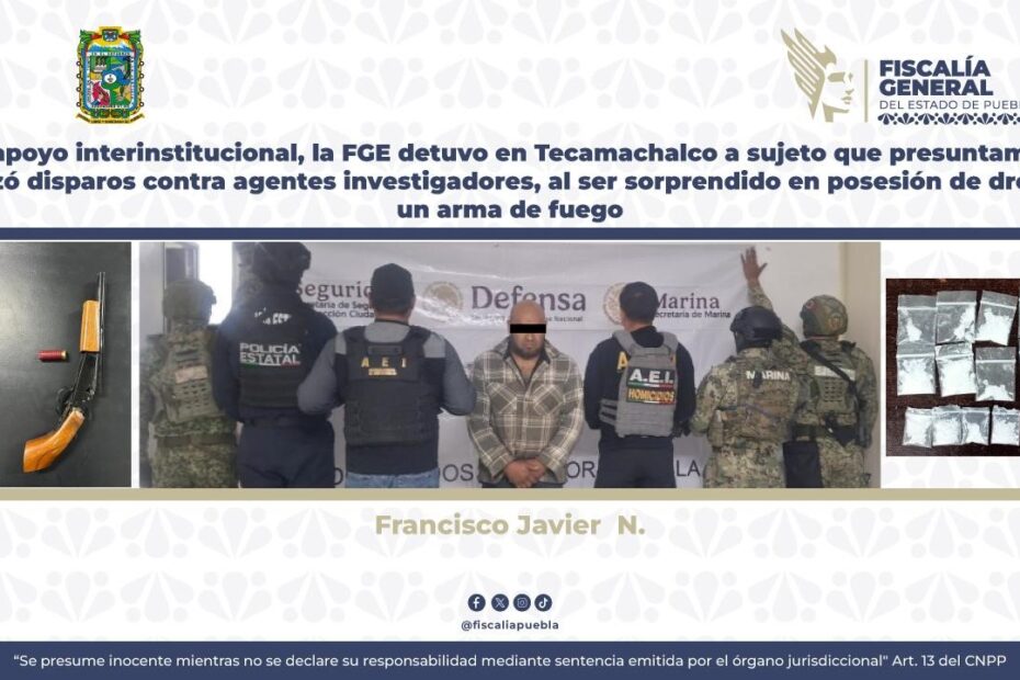 Con apoyo interinstitucional, la FGE detuvo en Tecamachalco a sujeto que presuntamente realizó disparos contra agentes investigadores, al ser sorprendido en posesión de droga y un arma de fuego