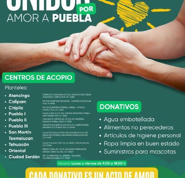 El director general de Conalep Puebla, Juan Antonio Martínez Martínez, informó que “Por Amor a Puebla” y en solidaridad con las familias poblanas, el colegio se sumó a este esfuerzo interinstitucional a invitación del Sistema DIF Estatal, cuyo Patronato es presidido por la señora Ceci Arellano, por lo que en 10 de los 12 centros educativos con los que cuenta en la entidad se recibirán provisiones en un horario de 9 a 18 horas, de lunes a viernes, a partir de este 13 de octubre.