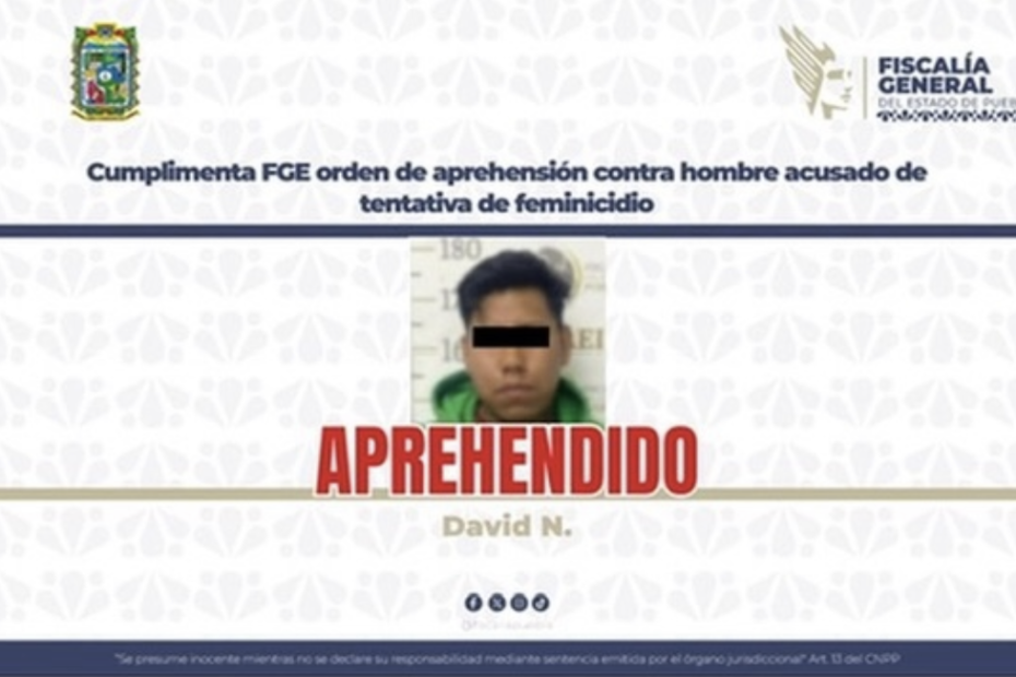 La Fiscalía General del Estado de Puebla (FGE) cumplió orden de aprehensión contra David N., como probable responsable del delito de feminicidio en grado de tentativa, en agravio de una mujer, hecho acontecido en el municipio de San Andrés Cholula.