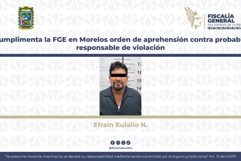 La Fiscalía General del Estado de Puebla, en coordinación con autoridades del estado de Morelos, cumplimentó una orden de aprehensión en contra de Efraín Eulalio N., de 66 años de edad, señalado como probable responsable del delito de violación en agravio de su expareja sentimental.