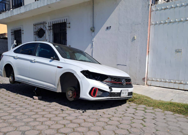A plena luz del día, los delincuentes se llevaron las cuatro llantas del volkswagen e incluso cargaron con la puerta de la cajuela.