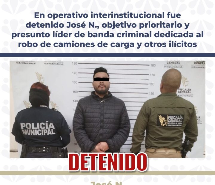 Como resultado de la coordinación interinstitucional entre autoridades de los tres órdenes de gobierno, se logró la detención de José N., presunto objetivo prioritario e identificado como posible líder de una banda criminal dedicada al robo de camiones de carga con mercancía y otros ilícitos.