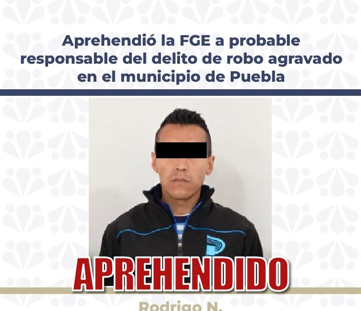 La Fiscalía General del Estado de Puebla cumplimentó la orden de aprehensión en contra de Rodrigo N., de 35 años de edad, por su probable responsabilidad en el delito de robo agravado, ocurrido en el municipio de Puebla.