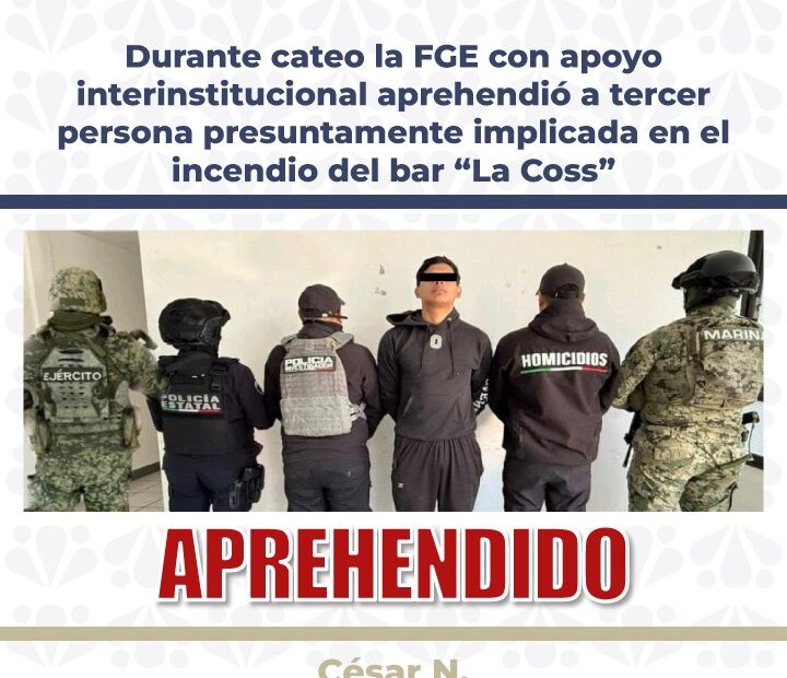 Derivado de una intensa labor de inteligencia y coordinación interinstitucional, la Fiscalía General del Estado de Puebla, con apoyo de la Secretaría de Marina (SEMAR), la Secretaría de la Defensa (DEFENSA), la Guardia Nacional (GN) y la Secretaría de Seguridad Pública Estatal (SSPE), desahogo un cateo que permitió la detención de César N., de 19 años de edad, quien contaba con orden de aprehensión por su presunta participación en el incendio del bar “La Coss”.