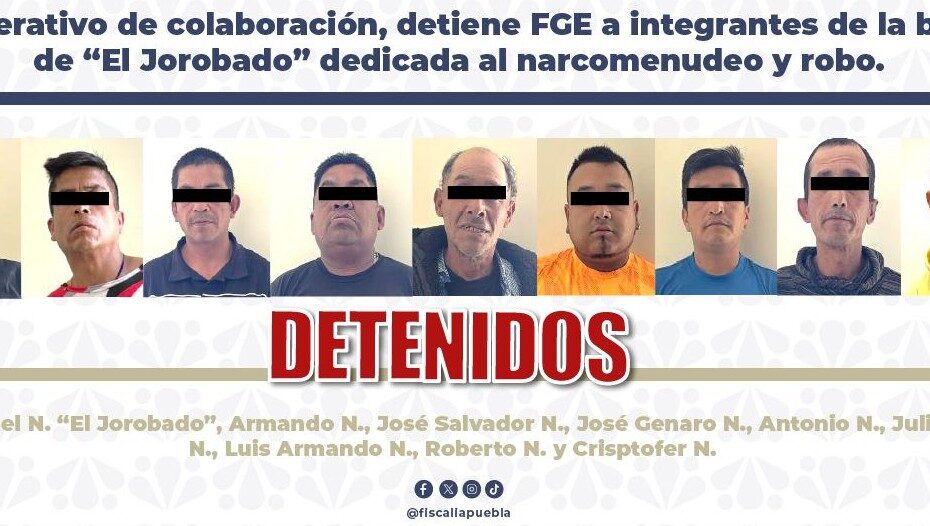 En un operativo de colaboración con Policía Municipal y Estatal, la Fiscalía General del Estado de Puebla (FGE), detuvo el 25 de marzo a nueve personas identificadas como integrantes de la banda de “El Jorobado”, dedicada al narcomenudeo, robo a transporte público y robo a transeúnte en el municipio de Puebla y zona metropolitana.