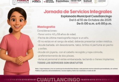 El gobierno municipal de Cuautlancingo invita a la ciudadanía a la “Jornada de Servicios Integrales de Salud”, que se llevará a cabo en conjunto con la Secretaría de Salud del gobierno del estado y el hospital ISSSTEP, del lunes 6 de octubre al viernes 10 en la Explanada Municipal.
