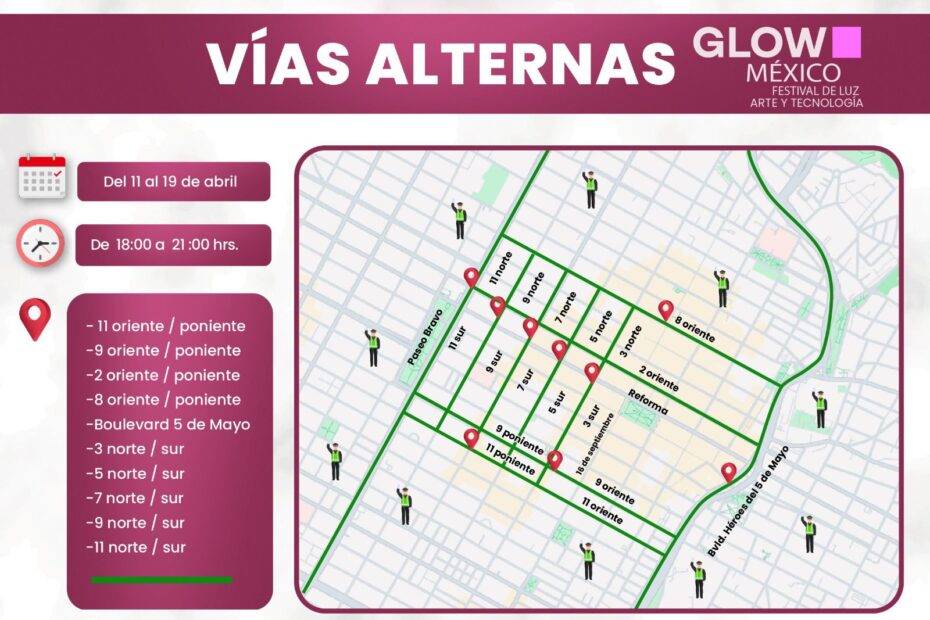 Con motivo del Festival Glow México, se habilitan vías alternas en el Centro Histórico del 11 al 19 de abril, a partir de las 18:00 a 21:00 hrs, para facilitar la movilidad durante los cierres viales.