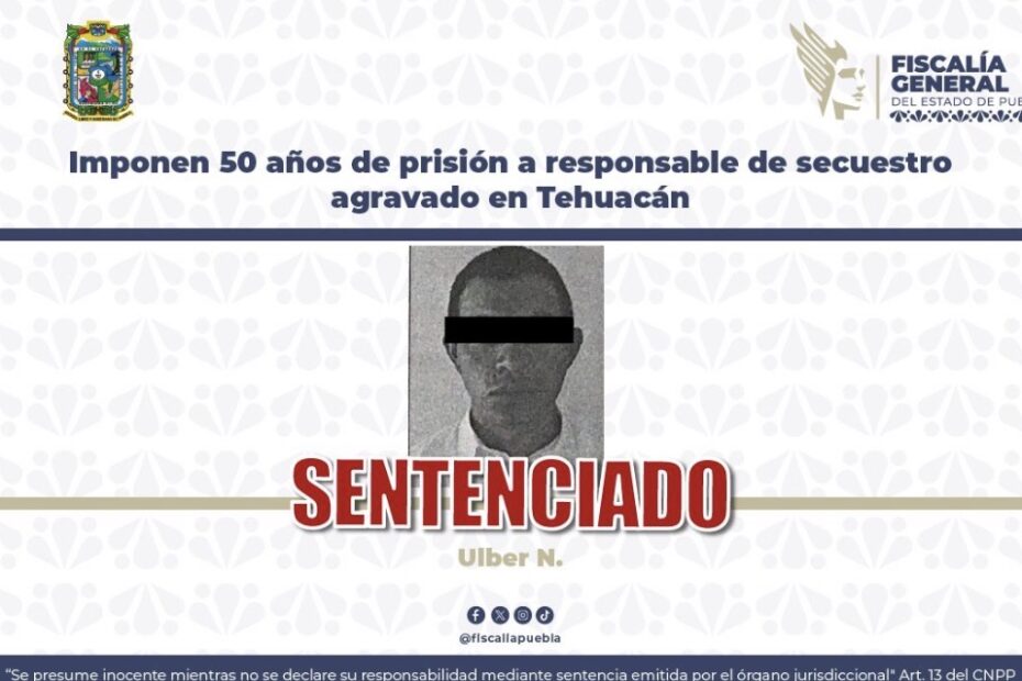 Tras el desahogo del juicio oral, la Fiscalía General del Estado de Puebla (FGE) obtuvo sentencia condenatoria contra Ulber N., de 41 años, por su responsabilidad en el delito de secuestro agravado de un masculino, acto acontecido en el municipio de Tehuacán.