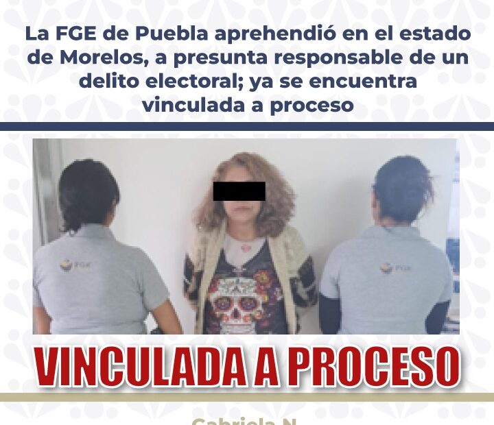 La Fiscalía General del Estado de Puebla informa que, como resultado de los actos de investigación y del cumplimiento de una orden de aprehensión ejecutada en colaboración con personal de la Fiscalía General del Estado de Morelos, se obtuvo la vinculación a proceso en contra de Gabriela N., señalada como probable participante en un delito electoral.