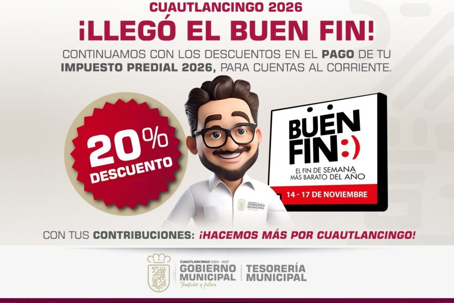Durante el Buen Fin del 14 al 17 de noviembre, se aplicará un 20% de descuento en el pago del predial 2026 a personas al corriente y un 100% en multas y recargos a las morosas que deben antes del 2025.