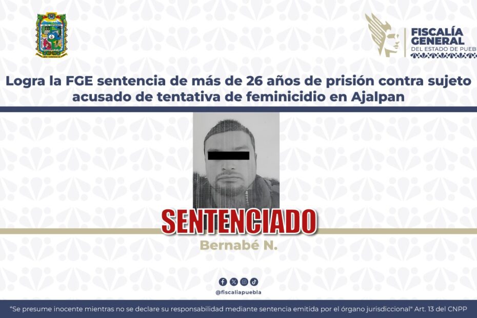 Como resultado de los argumentos presentados por la Fiscalía General del Estado de Puebla, se logró una sentencia de 26 años, 8 meses de prisión contra Bernabé N., acusado de feminicidio en grado de tentativa, ocurrido en Ajalpan.