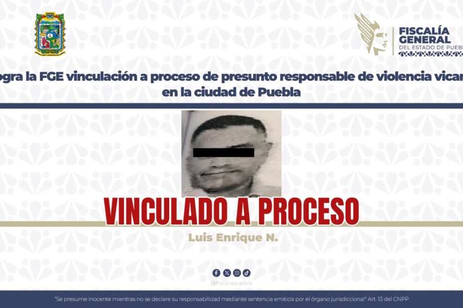 La Fiscalía General del Estado de Puebla obtuvo de la autoridad judicial la vinculación a proceso de Luis Enrique N., de 43 años, por su probable responsabilidad en los delitos de violencia familiar con su agravante de violencia vicaria y sustracción de menores.