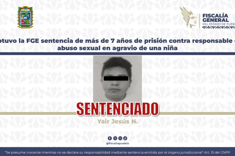 La Fiscalía General del Estado le dio seguimiento al procedimiento penal en contra de Yair Jesús N., acusado de abuso sexual ocurrido en Hueytamalco, Puebla, en agravio de una niña de 12 años de edad, logrando una sentencia en su contra de 7 años, 9 meses de prisión.