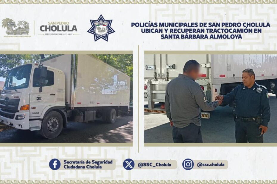 Policías municipales de San Pedro Cholula localizaron un tractocamión que había sido reportado como fuera de su ruta en la Junta Auxiliar de Santa Bárbara Almoloya. La unidad, marca Hino Motors modelo 2024, fue encontrada sobre la calle Camino Real a San Gabriel y Segunda de Bellas Artes tras un aviso ciudadano.