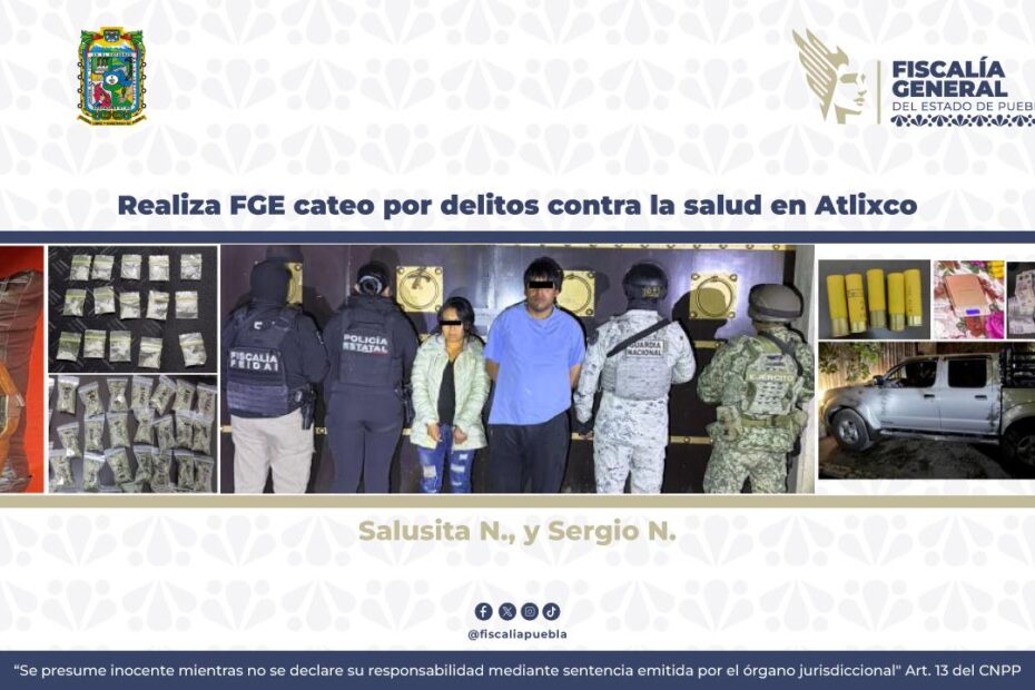 La Fiscalía General del Estado de Puebla (FGE) llevó a cabo un cateo en un inmueble del municipio de Atlixco por su probable relación con delitos contra la salud.