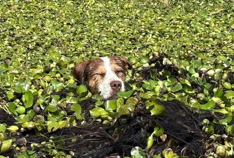 Personal de Protección Civil de Zacatelco, Tlaxcala rescató a un perrito que estaba atrapado entre los lirios de la presa de Acomulco.