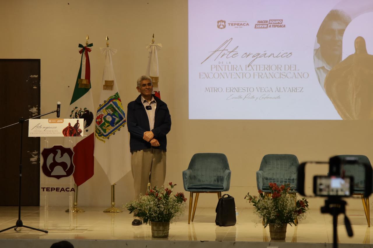 Con el objetivo de fortalecer la identidad cultural y el sentido de pertenencia en el municipio, el H. El Ayuntamiento de Tepeaca llevó a cabo la conferencia “Arte Orgánico de la Pintura Exterior del Exconvento Franciscano”, impartida por el reconocido escultor, pintor y conferencista, Mtro. Ernesto Vega Álvarez.