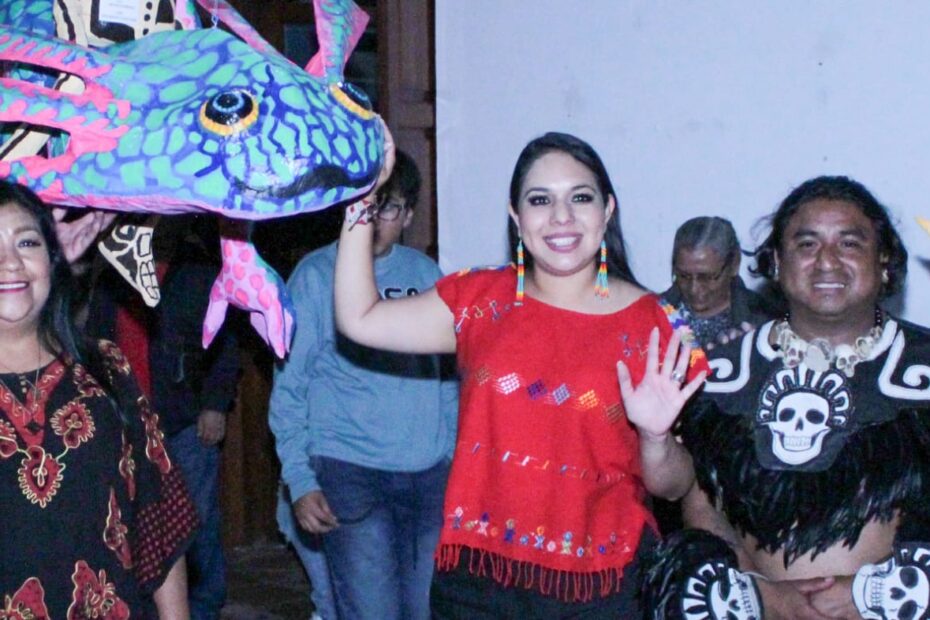 Durante el recorrido, la presidenta municipal visitó la ofrenda realizada con cartonería instalada en el Museo Casa del Caballero Águila, elaborada por estudiantes del Centro Cultural Iyolosiwa, con representaciones de animales mexicanos y seres mitológicos.