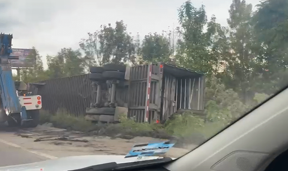 Automovilistas que circulaban por la zona captaron a la pesada unidad apostada sobre su costado derecho y fuera del camino.