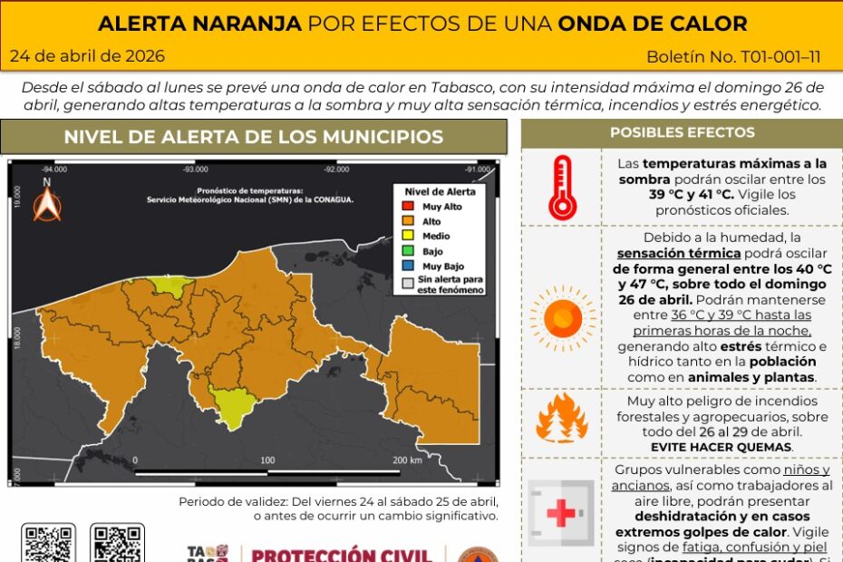 El Instituto de Protección Civil del Estado de Tabasco informó que a partir de este fin de semana y hasta el lunes 26 de abril se prevé una intensa onda de calor en la entidad, lo que ha llevado a la activación de la alerta naranja ante las altas temperaturas esperadas.