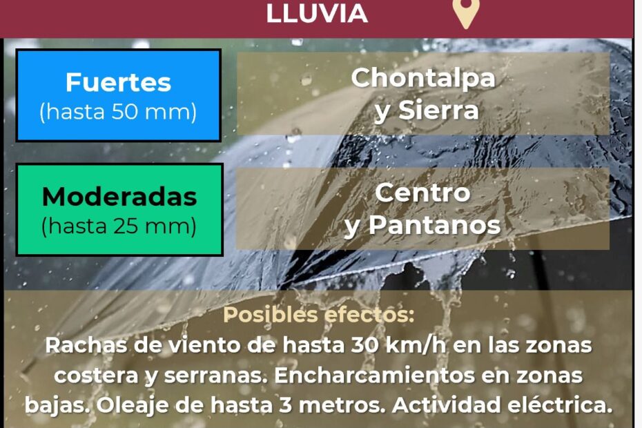 Asimismo, se pronostican vientos con rachas de hasta 50 kilómetros por hora, así como oleaje elevado que podría alcanzar hasta los 3 metros de altura.