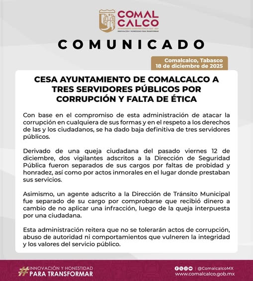 El Ayuntamiento de Comalcalco dio de baja definitiva a tres servidores públicos por presuntos actos de corrupción, falta de ética y conductas inmorales, como parte del compromiso de la actual administración municipal de combatir la corrupción y garantizar el respeto a los derechos de la ciudadanía.