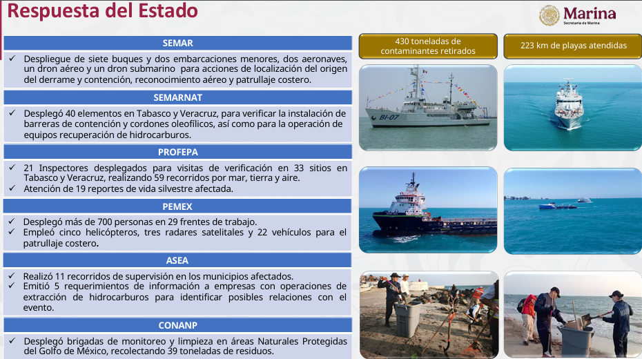 Finalmente, el secretario informó que, como resultado de estas acciones coordinadas, se han recolectado 430 toneladas de contaminantes y se han limpiado 223 kilómetros de playas, en un esfuerzo conjunto entre autoridades federales, estatales y municipales, bajo el marco del Plan Nacional de Contingencias y el Sistema de Comando de Incidentes.