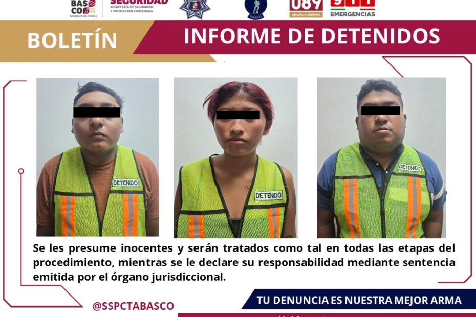 Elementos de la Secretaría de Seguridad y Protección Ciudadana de Tabasco (SSPC), en coordinación con la Fuerza Interinstitucional de Reacción Táctica Olmeca, detuvieron a cinco personas como presuntas responsables de delitos contra la Ley General de Salud y la Ley Federal de Armas de Fuego y Explosivos.