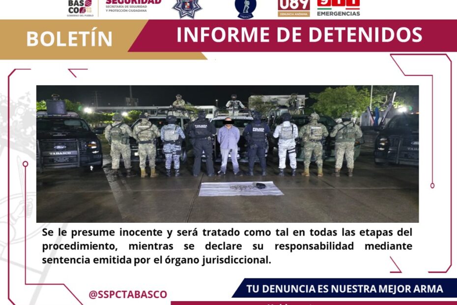 En una acción conjunta derivada de la Estrategia Antiextorsión y del Plan de Contención del Delito, elementos de la Secretaría de Seguridad y Protección Ciudadana (SSPC) y de la Fuerza Interinstitucional de Reacción Táctica (FIRT) Olmeca detuvieron a un ciudadano colombiano durante un operativo realizado en la colonia Tamulté de las Barrancas, en el municipio de Centro.