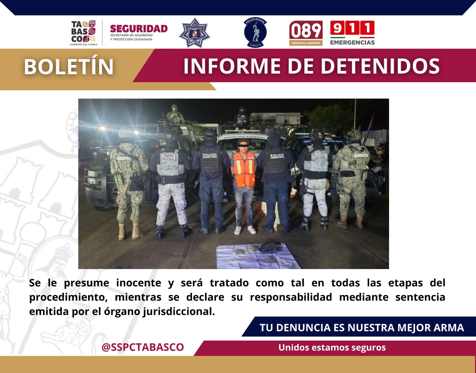 De acuerdo con el informe oficial, la detención se llevó a cabo mientras elementos de seguridad realizaban recorridos preventivos en la ranchería Emiliano Zapata, como parte de la Estrategia Antiextorsión y del Plan de Contención del Delito. En el lugar fue detenido Edgar “N”, alias “Nacho”, de 28 años de edad, originario de Guatemala.