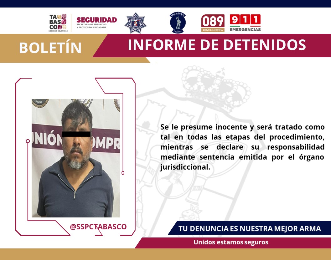 Durante recorridos de vigilancia y prevención del delito, elementos de la Fuerza Interinstitucional de Reacción Táctica (FIRT) Olmeca, en la que participa la Secretaría de Seguridad y Protección Ciudadana (SSPC) de Tabasco, lograron la detención de un masculino por su presunta responsabilidad en delitos contra la Ley General de Salud.