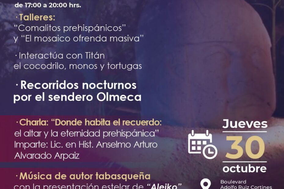 Por su parte, el jueves 30 de octubre el Parque Museo La Venta ofrecerá una experiencia única bajo el título “Donde habita el recuerdo: el altar y la eternidad prehispánica”, con actividades que combinan historia, arte y naturaleza. De 17:00 a 20:00 horas, los visitantes podrán participar en los talleres “Comalitos prehispánicos” y “El mosaico ofrenda masiva”, interactuar con Titán el cocodrilo, monos y tortugas, y recorrer de manera nocturna el sendero Olmeca. También se llevará a cabo la charla “Donde habita el recuerdo: el altar y la eternidad prehispánica”, a cargo del Lic. en Historia Anselmo Arturo Alvarado Arpaiz, y se contará con la presentación musical de la artista tabasqueña Aleiko.