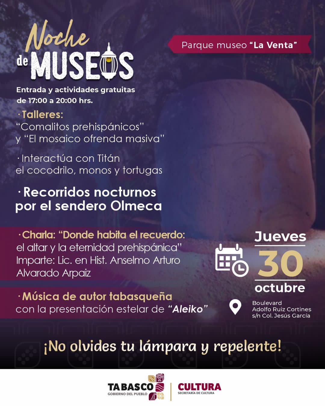 La Secretaría de Cultura del Estado de Tabasco invita al pueblo tabasqueño a disfrutar de dos grandes jornadas de la “Noche de Museos”, que se llevarán a cabo el sábado 25 y jueves 30 de octubre, con entrada gratuita en el Museo de Historia Natural “José Narciso Rovirosa Andrade” y el Parque Museo La Venta, respectivamente.