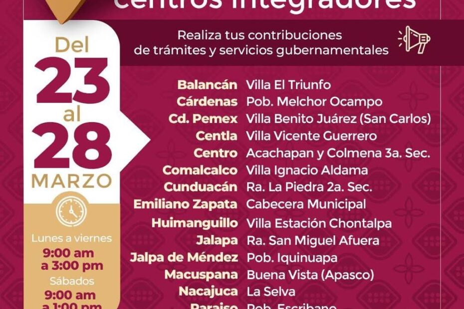 La secretaría de administración y finanzas del gobierno de Tabasco, dio inicio con atención en centros integradores de los 17 municipios del estado con el propósito de acercar los servicios a la ciudadanía.