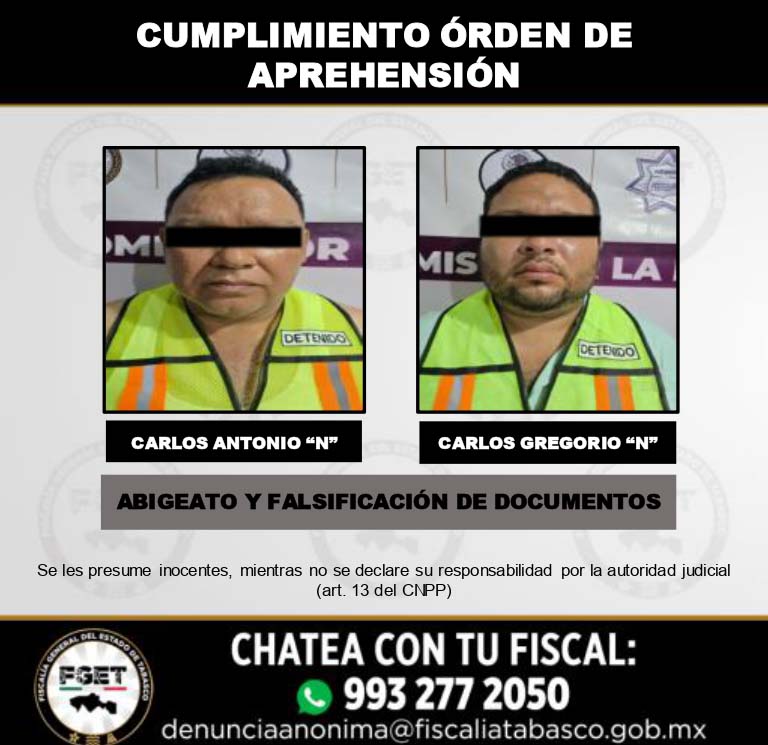 La Fiscalía General del Estado de Tabasco informó que la detención de Carlos Antonio “N” y Carlos Gregorio “N”, realizada el pasado 11 de abril, no fue un acto arbitrario, sino resultado del cumplimiento de órdenes de aprehensión emitidas por la autoridad judicial competente.
