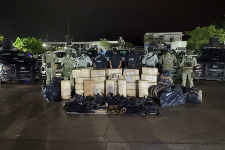 En el operativo fue detenido un sujeto identificado como Elías “N”, quien conducía una camioneta con caja seca. Al realizarle una inspección, los agentes hallaron 608 kilogramos de mercancía ilícita, tres chalecos tácticos, tres chalecos balísticos y un arma de fuego con cartuchos útiles.