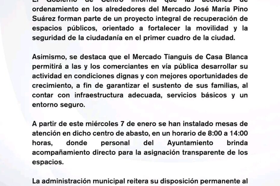 El Gobierno de Centro informó que las acciones de ordenamiento en los alrededores del Mercado José María Pino Suárez forman parte de un proyecto integral de recuperación de espacios públicos, cuyo objetivo es fortalecer la movilidad y la seguridad de la ciudadanía en el primer cuadro de la ciudad.