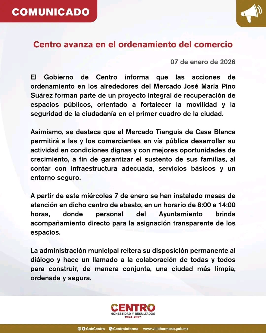 El Ayuntamiento de Centro reafirma su disposición permanente al diálogo y hace un llamado a la colaboración de la ciudadanía para construir juntos una ciudad más limpia, ordenada y se