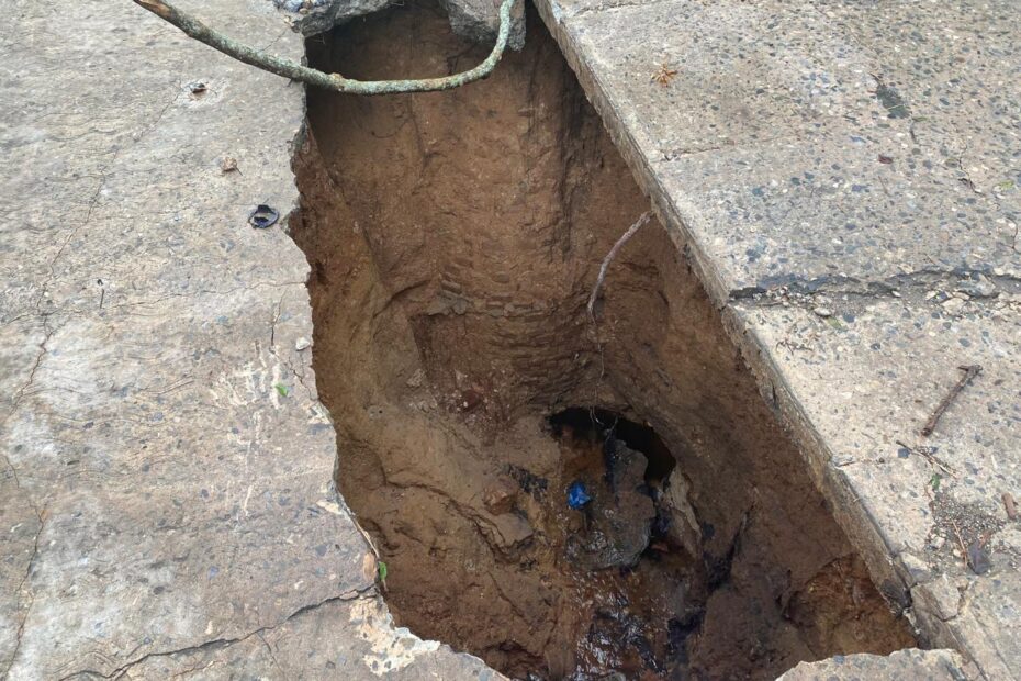 En la profundidad del socavón se observa el paso de agua potable lo cual propicia el deslave del mismo debido a una fuga.