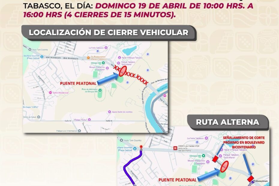 La Secretaría de Ordenamiento Territorial y Obras Públicas informa que, este domingo 19 de abril, entre las 10:00 y las 16:00 horas, se realizarán cierres intermitentes a la circulación del boulevard Bicentenario, frente al Parque Tabasco ‘Dora María’, para la colocación de la estructura del puente peatonal.