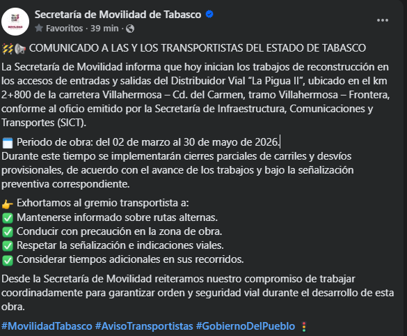 La Secretaría de Movilidad de Tabasco informó que este 2 de marzo dieron inicio los trabajos de reconstrucción en los accesos del Distribuidor Vial La Pigua II, ubicado en el kilómetro 2+800 de la carretera Villahermosa–Ciudad del Carmen, en el tramo Villahermosa–Frontera.