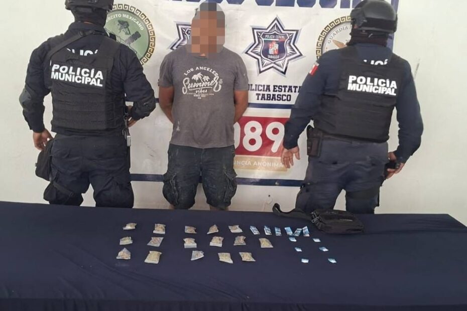 Elementos de la Policía Municipal de Comalcalco detuvieron a un masculino en posesión de presuntas drogas, luego de que intentara sobornar a los uniformados durante un operativo de prevención del delito en la ranchería José María Pino Suárez, primera sección.