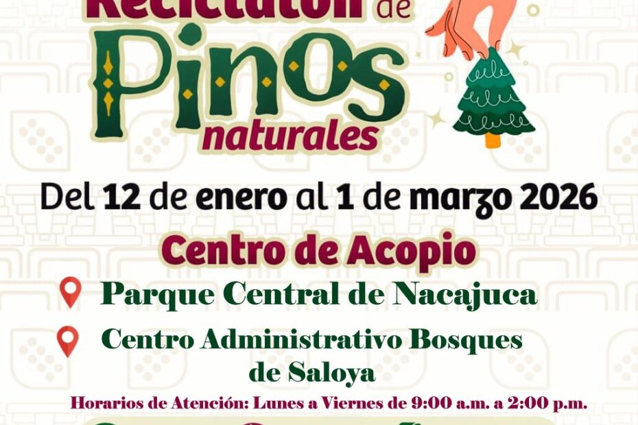 El Ayuntamiento de Nacajuca hace un llamado a la ciudadanía para sumarse al 17.º Reciclatón de Pinos Naturales 2026, una iniciativa que busca fomentar el cuidado del medio ambiente y la correcta disposición de los árboles navideños.