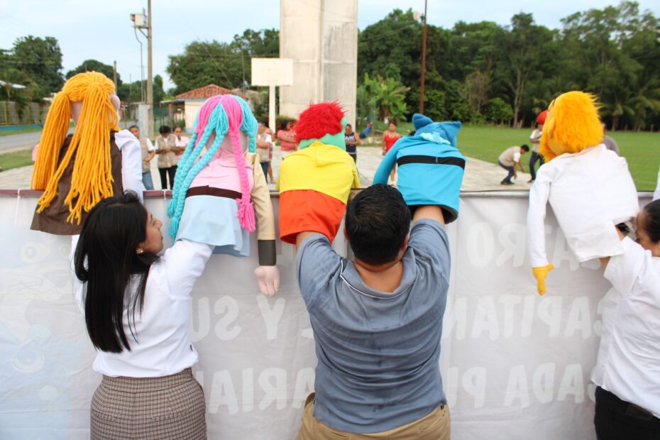 En el Ejido Buenaventura, de Cunduacán, los pequeños presenciaron la obra de teatro guiñol ‘El Capitán Azul y su Brigada Planetaria’, donde el temible Doctor Corrosión pretende contaminar los ríos de Tabasco, pero esta intención es impedida por un grupo de valientes defensores de la naturaleza encabezados por el ‘Capitán Azul’, que es una simpática nutria o perro de agua, igual a las que habitan en los distintos ríos y lagunas del Estado.